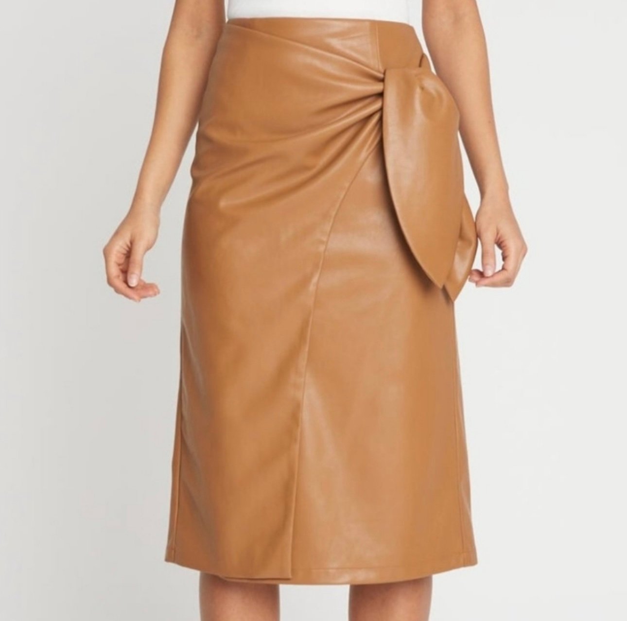 Faux Leather MIDI Skirt in Camel Color.